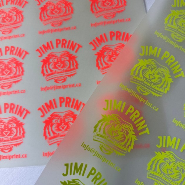 Neon-Transfers werden mit der klassischen Siebdrucktechnologie hergestellt. Neonfarben werden als hervorhebendes Element in 7 Farbtönen Pantone C P 801 - 807 verwendet. Die Farben müssen mit weißer Farbe unterlegt werden, um ihre Strahlkraft zu erreichen.